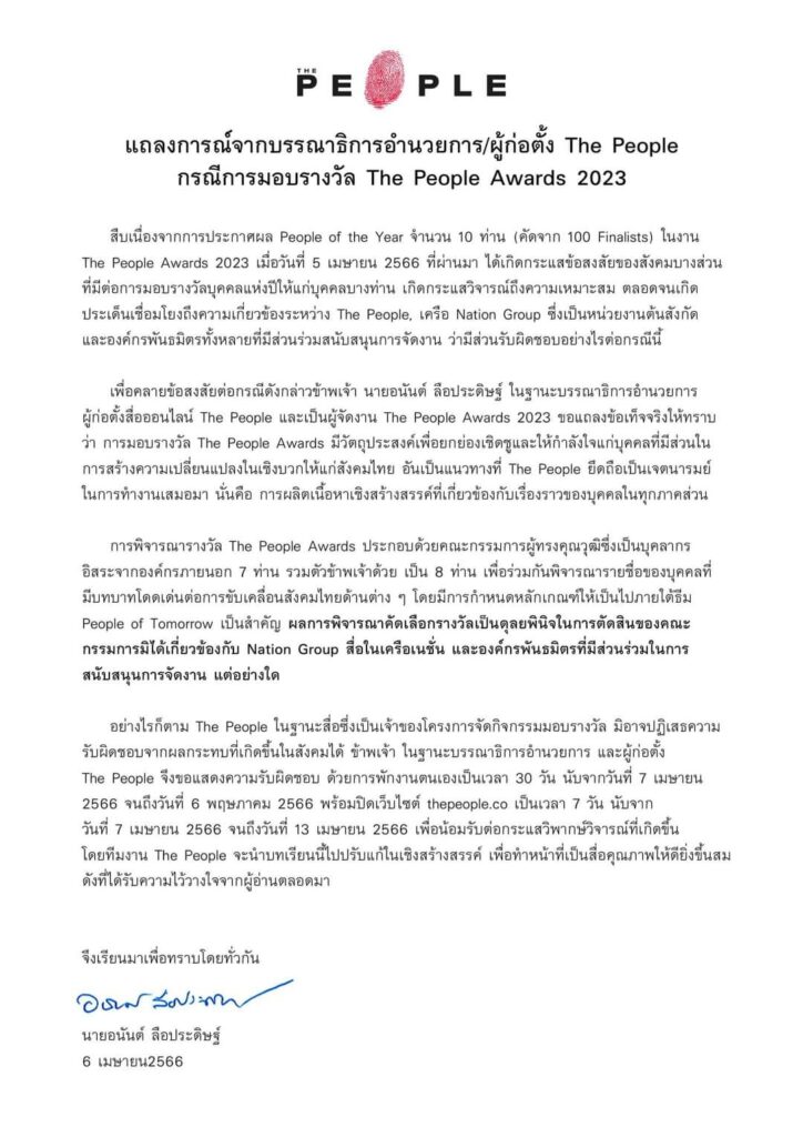 ซึ่งต่อมาบรรดาผู้ที่เกี่ยวข้อง ไม่ว่าจะเป็นต้นสังกัดอย่างเครือเดอะเนชั่น หรือบรรณาธิการบริหาร ของ The People โต้โผในการจัดงาน รวมถึงผู้สนับสนุนบางราย จะออกมาแถลงข่าวเพื่อชี้แจงให้สังคมรับทราบ