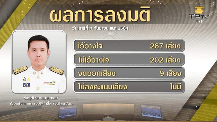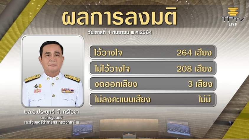ผู้สื่อข่าวโตโจ้นิวส์รายงานว่า ผลการลงมติ ญัตติ อภิปรายไม่ไว้วางใจ ที่ประชุมสภาผู้แทนราษฎร 4 ก.ย. 2564 พล.อ.ประยุทธ์ จันทร์โอชา นายกรัฐมนตรีและรมว.กลาโหม