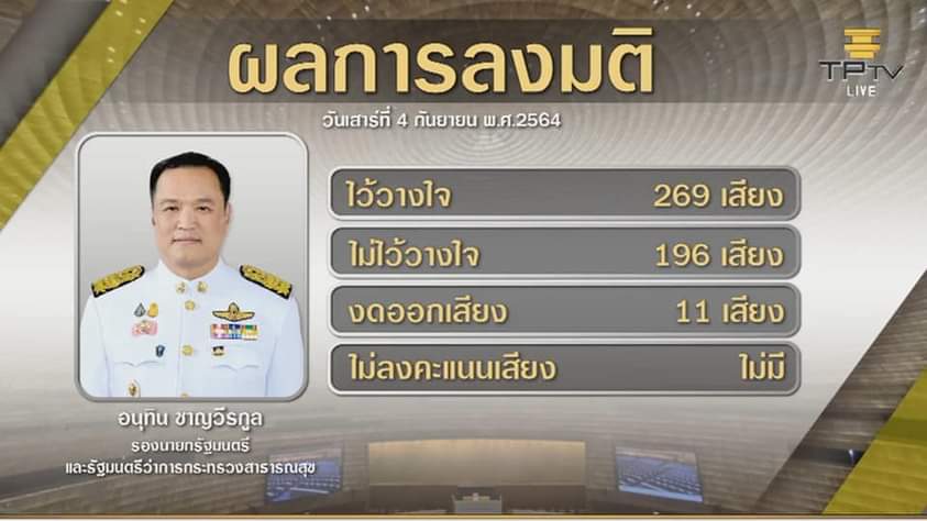 นายอนุทิน ชาญวีรกูล จำนวนผู้ลงคะแนนจาก 476 ไว้วางใจ 269 ไม่ไว้วางใจ 196 งด 11