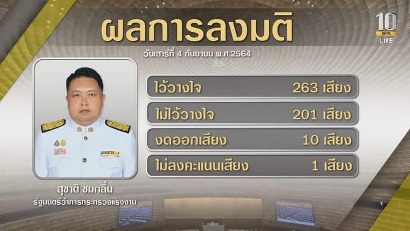 นายสุชาติ ชมกลิ่น จำนวนผู้ลงคะแนน 475 ไว้วางใจ 263 ไม่ไว้วางใจ 201 งด 1