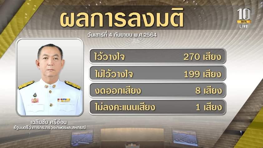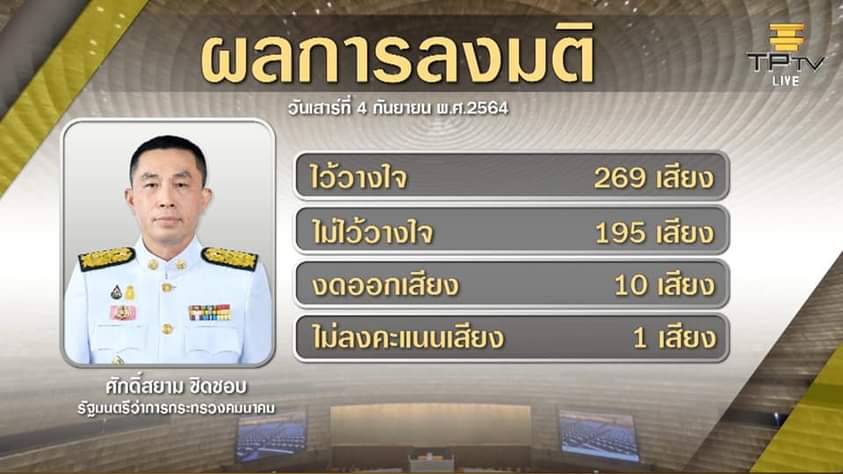 นายศักดิ์สยาม ชิดชอบ จำนวนผู้ลงคะแนน 475 ไว้วางใจ 269 ไม่ไว้วางใจ 195 งด 10 ไม่ออกเสียง1