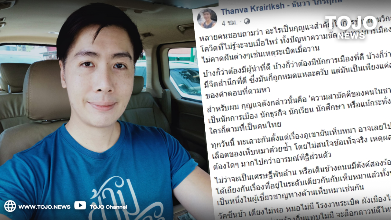 ผู้สื่อข่าวโตโจ้นิวส์รายงานว่า นายธันวา ไกรฤกษ์ ทีมงาน ‘กล้าอาสา’ ของพรรคกล้า ซึ่งช่วยประสานหาเตียงผู้ติดเชื้อโควิด แสดงความเห็นส่วนตัว โดยระบุว่า หลายคนชอบถามว่า อะไรเป็นกุญแจสำคัญในการข้ามผ่านวิกฤตต่างๆ ทั้งโควิดที่ไม่รู้จะจบเมื่อไหร่ ทั้งปัญหาความขัดแย้งทางการเมือง รวมถึงเรื่องไม่คาดฝันต่างๆเช่นเหตุระเบิดเมื่อวาน