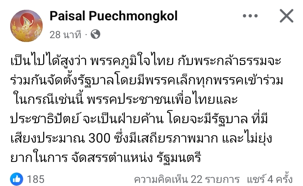 เป็นไปได้สูงว่า พรรคภูมิใจไทย กับพรรคกล้าธรรมจะร่วมกันจัดตั้งรัฐบาลโดยมีพรรคเล็กทุกพรรคเข้าร่วม