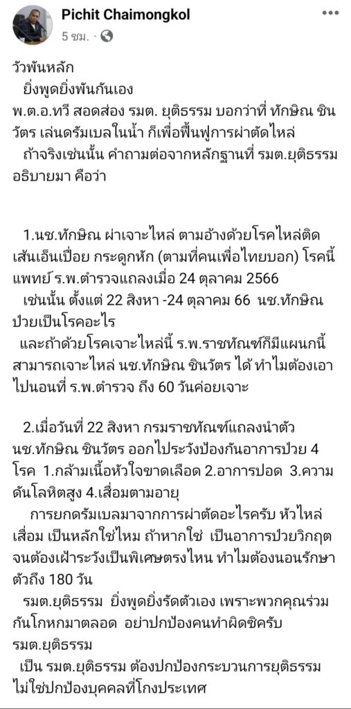 พิชิต ชี้ โรคเจาะไหล่นี้ ร.พ.ราชทัณฑ์ก็มีแผนกนี้สามารถเจาะไหล่ นช.ทักษิณ ชินวัตร ได้ ทำไมต้องเอาไปนอนที่ ร.พ.ตำรวจ