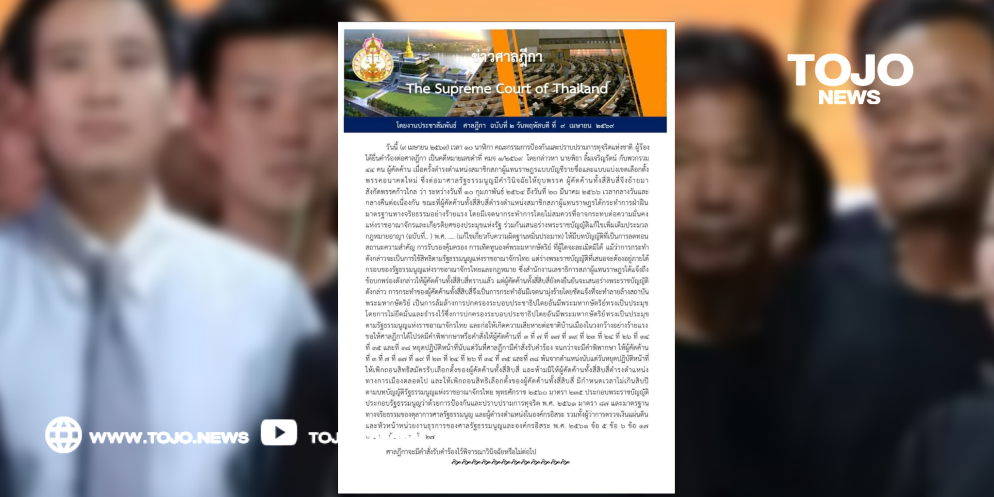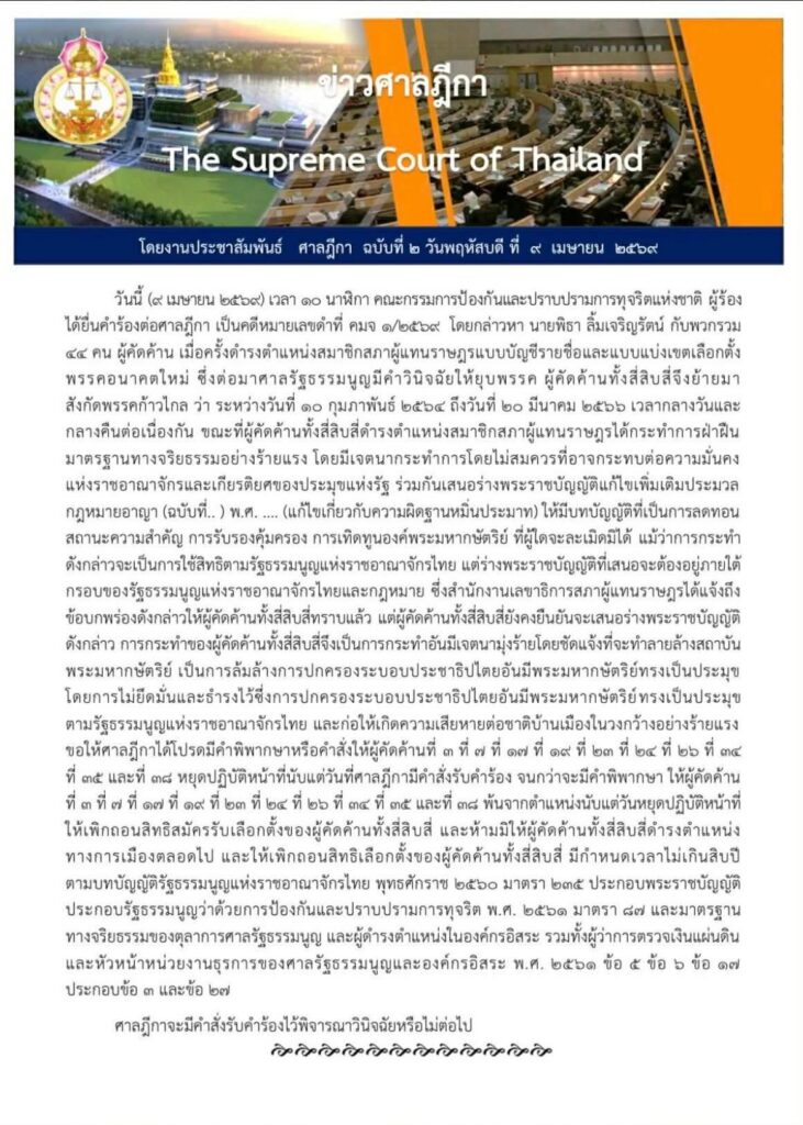 ผู้สื่อข่าวโตโจ้นิวส์รายงานว่า งานประชาสัมพันธ์ ศาลฎีกา ออกอกเอกสารข่าวระบุว่า (9 เมษายน 2569) คณะกรรมการป้องกันและปราบปรามการทุจริตแห่งชาติ ผู้ร้อง ได้ยื่นคำร้องต่อศาลฎีกา เป็นคดีหมายเลขดำที่ คมจ 1/2569 โดยกล่าวหา นายพิธา ลิ้มเจริญรัตน์ กับพวกรวม 44 คน ผู้คัดค้าน เมื่อครั้งดำรงตำแหน่งสมาชิกสภาผู้แทนราษฎรแบบบัญชีรายชื่อและแบบแบ่งเขตเลือกตั้ง พรรคอนาคตใหม่ ซึ่งต่อมาศาลรัฐธรรมนูญมีคำวินิจฉัยให้ยุบพรรค ผู้คัดค้านทั้ง 44 จึงย้ายมาสังกัดพรรคก้าวไกล ว่า