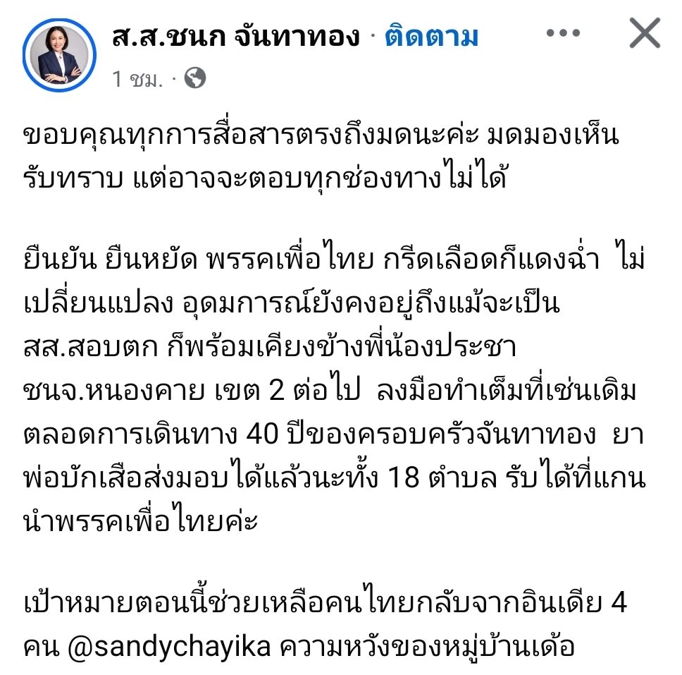 ผู้สื่อข่าวโตโจ้นิวส์รายงานว่า นางสาวชนก จันทาทอง ผู้สมัครรับเลือกตั้งสมาชิกสภาผู้แทนราษฎร เขตเลือกตั้งที่ 2 จ.หนองคาย พรรคเพื่อไทย โพสต์ระบุว่า…