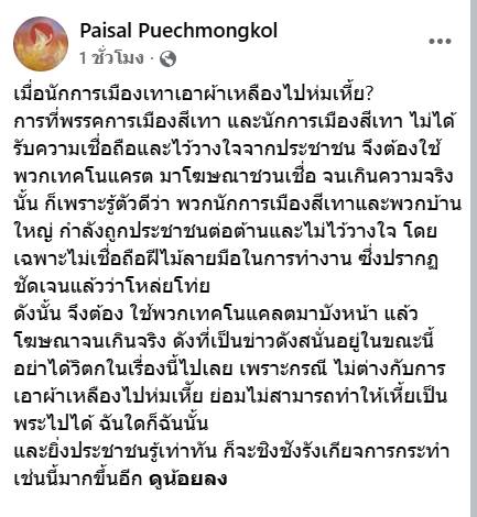 การที่พรรคการเมืองสีเทา และนักการเมืองสีเทา ไม่ได้รับความเชื่อถือและไว้วางใจจากประชาชน จึงต้องใช้พวกเทคโนแครต มาโฆษณาชวนเชื่อ จนเกินความจริงนั้น ก็เพราะรู้ตัวดีว่า