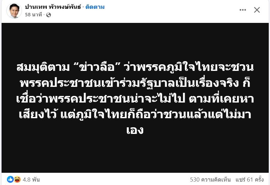 สมมุติตาม “ข่าวลือ” ว่าพรรคภูมิใจไทยจะชวนพรรคประชาชนเข้าร่วมรัฐบาลเป็นเรื่องจริง ก็เชื่อว่าพรรคประชาชนน่าจะไม่ไป ตามที่เคยหาเสียงไว้ แต่ภูมิใจไทยก็ถือว่าชวนแล้วแต่ไม่มาเอง