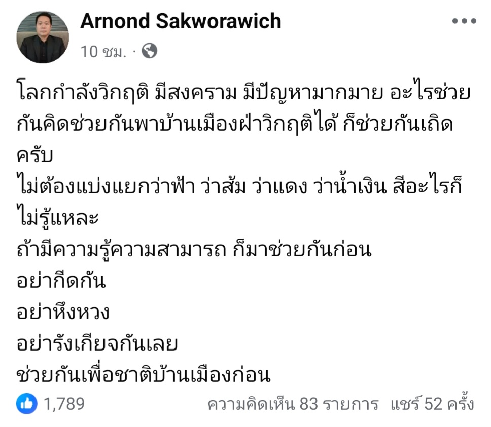 โลกกำลังวิกฤติ มีสงคราม มีปัญหามากมาย อะไรช่วยกันคิดช่วยกันพาบ้านเมืองฝ่าวิกฤติได้ ก็ช่วยกันเถิดครับ