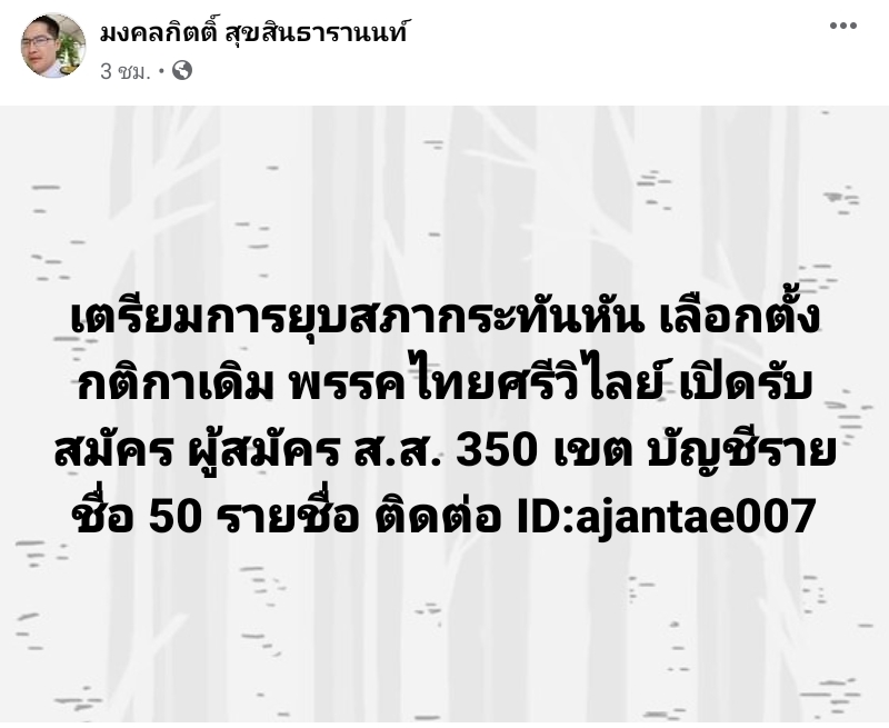 ผู้สื่อข่าวโตโจ้นิวส์รายงานว่า วันที่ 12 ก.ย.64 นายมงคลกิตติ์ สุขสินธารานนท์ ส.ส.บัญชีรายชื่อ และหัวหน้าพรรคไทยศรีวิไลย์ โพสต์ข้อความผ่านเฟซบุ๊กส่วนตัว ระบุว่า เตรียมการยุบสภากระทันหัน เลือกตั้งกติกาเดิม พรรคไทยศรีวิไลย์ เปิดรับสมัคร ผู้สมัคร ส.ส. 350 เขต บัญชีรายชื่อ 50 รายชื่อ ติดต่อ ID:ajantae007
