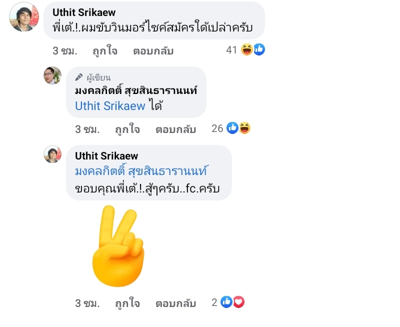 ต่อมา มีผู้คอมเม้นสอบถามว่า “พี่เต้.!.ผมขับวินมอร์ไซค์สมัครใด้เปล่าครับ” โดย เต้ มาตอบกลับว่า “ได้”