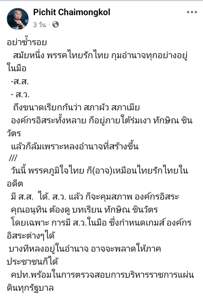 พิชิต คปท. ชี้ อย่าซ้ำรอย สมัยหนึ่ง พรรคไทยรักไทย กุมอำนาจทุกอย่างอยู่ในมือ