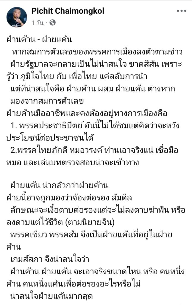 พิชิต มอง ฝ่ายรัฐบาลจะกลายเป็นไม่น่าสนใจ หากสมการตัวเลขของพรรคการเมืองลงตัวตามข่าว