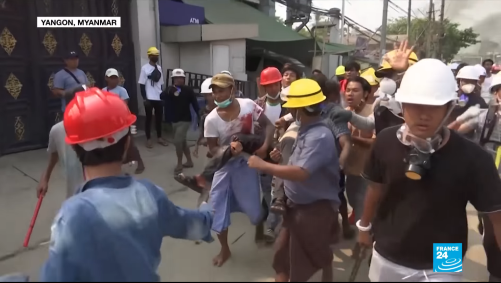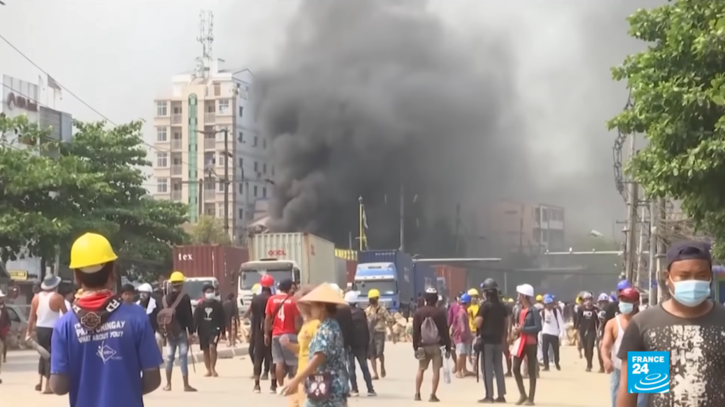 ผู้สื่อข่าวต่างประเทศ สำนักข่าวโตโจ้นิวส์รายงานว่า เหตุความวุ่นวายจากการประท้วงการรัฐประหารของทหารเมียนมา ส่อแววที่จะดุเดือดรุนแรงมากขึ้นทุกขณะ โดยที่เมืองย่างกุ้งในวันอาทิตย์ (14 มี.ค.64) ที่ผ่านมา ที่ย่านอุตสาหกรรม หล่ายตายา ได้เกิดเหตุ บุกเข้าไปเผาโรงงานหลายแห่งที่คาดว่า จีน ให้การสนับสนุนทางการเงิน จนมีกลุ่มควันดำพวยพุงทั่วบริเวณ ในขณะที่เสียงปืนจากกองกำลังความมั่นคงของเมียนมาที่เปิดฉากยิงเข้าใส่ผู้ก่อเหตุประท้วงในบริเวณดังกล่าว และได้ทำให้ผู้ประท้วงที่ก่อเหตุเสียชีวิตอย่างน้อย 22 ราย และยังมีรายงานว่า มีผู้ชุมนุมอีกอย่างน้อย 16 คนเสียชีวิตในเมืองอื่นๆ รวมถึงที่เมืองมัณฑะเลย์ และเมืองพะโค และที่ที่เมืองพะโค มีนายตำรวจ 1 นายเสียชีวิตลงด้วยบาดแผลบริเวณหน้าอก หลังจากเผชิญหน้ากับพวกกลุ่มผู้ชุมนุม เป็นตำรวจนายที่ 2 ที่เสียชีวิตท่ามกลางการประท้วง ส่งผลให้วันอาทิตย์ที่ผ่านมาเป็นวันที่มีการนองเลือดจากการประท้วงมากที่สุดนับตั้งแต่มีการรัฐประหารเมื่อวันที่ 1 กุมภาพันธ์