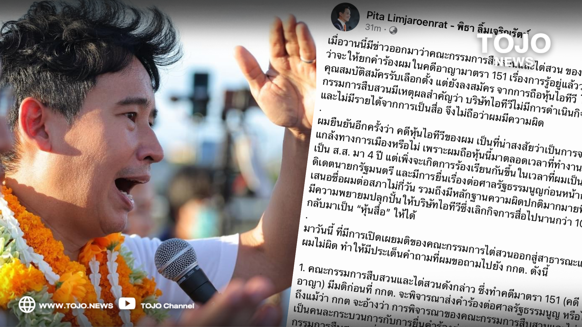 ผู้สื่อข่าวโตโจ้นิวส์รายงานว่า 15 ส.ค.66 นายพิธา ลิ้มเจริญรัตน์ หัวหน้าพรรคก้าวไกล โพสต์ข้อความผ่านเฟซบุ๊ก กรณีหุ้นสื่อ ITV โดยระบุว่า
