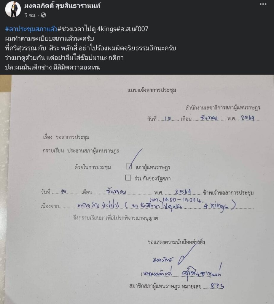 ผู้สื่อข่าวโตโจ้นิวส์รายว่า 15 ธ.ค.64 นายสิระ เจนจาคะ ส.ส.กทม.พรรคพลังประชารัฐ เปิดถึงกรณีนายมงคลกิตติ์ สุขสินธารานนท์ หัวหน้าพรรคไทยศรีวิไลย์ ได้ทำการโพสต์ข้อความผ่านช่องทางเฟซบุ๊กส่วนตัวถึงลาประชุมสภา เพื่อเดินทางเพื่อไปดูภาพยนต์ 4 Kings และระบุ “สิระ หลักสี่ อย่าไปร้องผมผิดจริยธรรมอีกนะครับ”ว่า จริง ๆ แล้วการลาประชุมสภาฯ สามารถทำได้ หากมีเหตุผลและงานอื่นที่สำคัญจริง ๆ ซึ่งวันนี้เป็นวันพุธระเบียบวาระประชุม คือ เรื่องกฎหมายของประเทศชาติที่มีความสำคัญ ต้องลงมติตลอดเวลา มันสมควรหรือไม่ที่เอาเวลาราชการไปเข้าโรงหนัง เพราะถ้าเป็นงานศพของเครือญาติจะลาไปก็คงไม่มีใครว่า