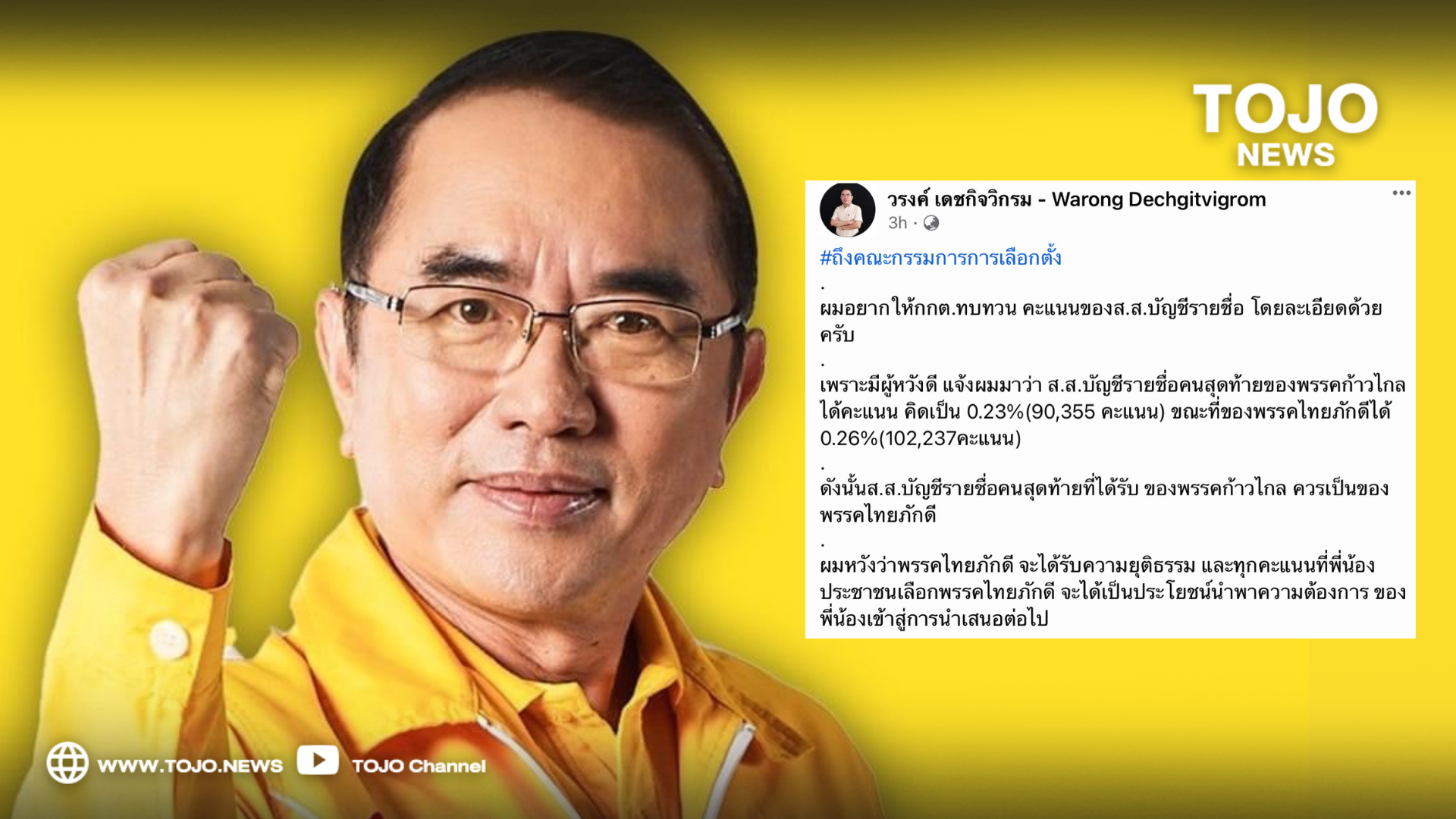 เพราะมีผู้หวังดี แจ้งผมมาว่า ส.ส.บัญชีรายชื่อคนสุดท้ายของพรรคก้าวไกล ได้คะแนน คิดเป็น 0.23%(90,355 คะแนน) ขณะที่ของพรรคไทยภักดีได้ 0.26%(102,237คะแนน)