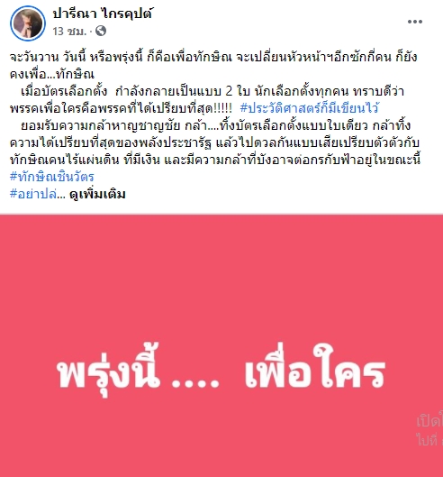 ผู้สื่อข่าวโตโจ้นิวส์รายงานว่า น.ส.ปารีณา ไกรคุปต์ ส.ส.ราชบุรี พรรคพลังประชารัฐ โพสต์ข้อความผ่านเฟซบุ๊กส่วนตัว ระบุว่า พรุ่งนี้ …เพื่อใคร จะวันวาน วันนี้ หรือพรุ่งนี้ ก็คือเพื่อนายทักษิณ ชินวัตร นักโทษหนีคดี จะเปลี่ยนหัวหน้าฯ อีกซักกี่คนก็ยังคงเพื่อ…ทักษิณ เมื่อบัตรเลือกตั้งกำลังกลายเป็นแบบ 2 ใบ นักเลือกตั้งทุกคนทราบดีว่า พรรคเพื่อใครคือพรรคที่ได้เปรียบที่สุด ประวัติศาสตร์ก็มีเขียนไว้