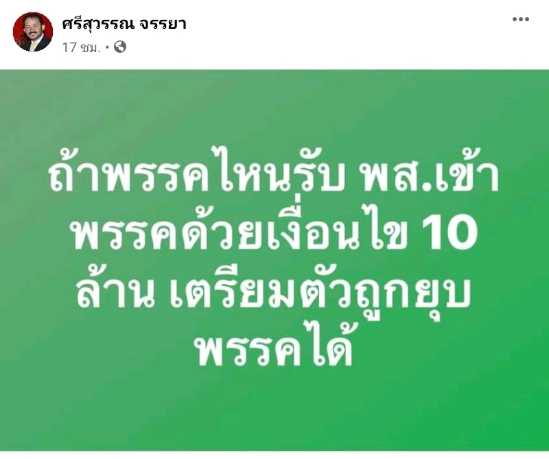 ศรีสุวรรณ ขู่ พรรคไหนรับ พส.เข้าพรรคด้วยเงื่อนไข 10 ล้าน เตรียมถูกยุบพรรคได้