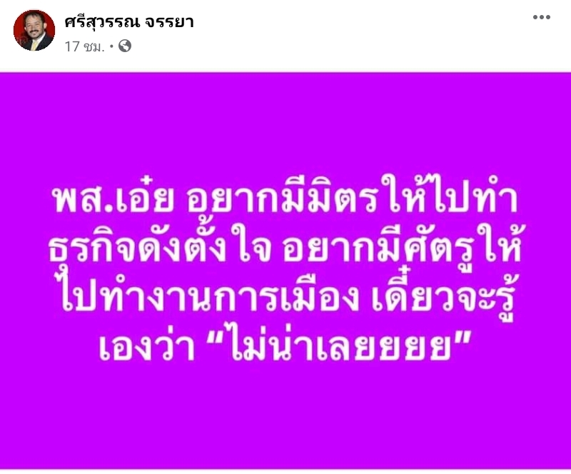 “พส.เอ๋ย อยากมีมิตรให้ไปทำธุรกิจดังตั้งใจ อยากมีศัตรูให้ไปทำงานการเมืองเดี๋ยวจะรู้เองว่าไม่น่าเลย”