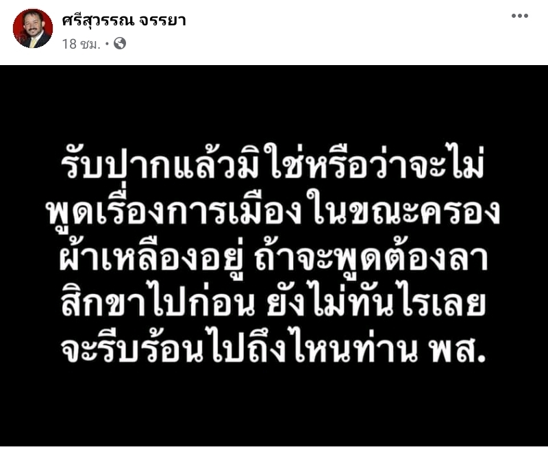 ในเรื่องนี้นายศรีสุวรรณ จรรยา เลขาธิการสมาคมพิทักษ์รัฐธรรมนูญไทย โพสต์ข้อความในเฟซบุ๊กดังนี้ “รับปากแล้วมิใช่หรือว่าจะไม่พูดเรื่องการเมือง ในขณะครองผ้าเหลืองอยู่ ถ้าจะพูดต้องลาสิกขาไปก่อน ยังไม่ทันไรเลยจะรีบร้อนไปถึงไหนท่านพส.”