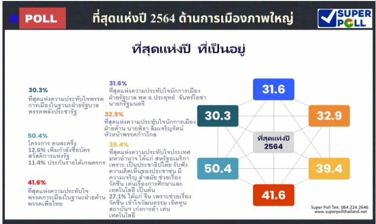 ผู้สื่อข่าวโตโจ้นิวส์รายงานว่า ผศ.นพดล กรรณิกา ผู้อำนวยการสำนักวิจัยซูเปอร์โพล เสนอผลสำรวจเรื่อง ที่สุดแห่งปี 2564 ด้านการเมืองภาพใหญ่ กรณีศึกษาประชาชนทุกสาขาอาชีพทั่วประเทศ จำนวน 1,086 ตัวอย่าง ระหว่างวันที่ 11-17 ธ.ค.ที่ผ่านมาพบว่า นักการเมืองฝ่ายรัฐบาล ที่น่าประทับใจและน่าพอใจที่สุดแห่งปี 2564 โดย 3 อันดับแรก ได้แก่ พล.อ.ประยุทธ์ จันทร์โอชา นายกรัฐมนตรี ร้อยละ 31.6 อันดับที่ 2 ได้แก่ นายจุรินทร์ ลักษณวิศิษฏ์ รองนายกรัฐมนตรี และรัฐมนตรีว่าการกระทรวงพาณิชย์ ร้อยละ 22.4 และอันดับที่ 3 ได้แก่ นายวราวุธ ศิลปอาชา รัฐมนตรีว่าการกระทรวงทรัพยากรธรรมชาติและสิ่งแวดล้อม ร้อยละ 8.8
