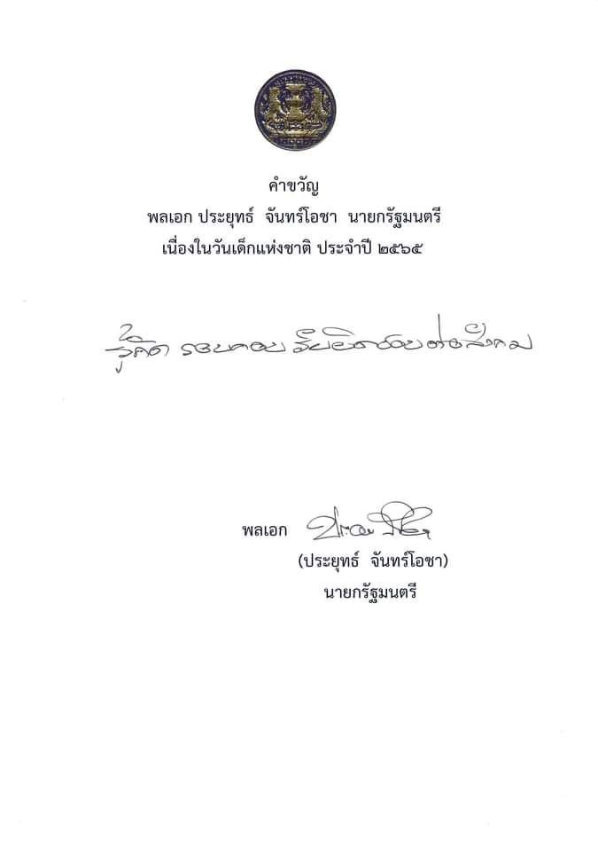 ผู้สื่อข่าวโตโจ้นิวส์รายงานว่า นายธันวา ไกรฤกษ์ อดีตผู้สมัคร ส.ส.กทม.พรรคพลังประชารัฐ ระบุภายหลังที่ พลเอกประยุทธ์ จันทร์โอชา นายกรัฐมนตรี ได้มอบคำขวัญเนื่องในวันเด็กแห่งชาติ ประจำปี 2565 “รู้คิด รอบคอบ รับผิดชอบต่อสังคม”