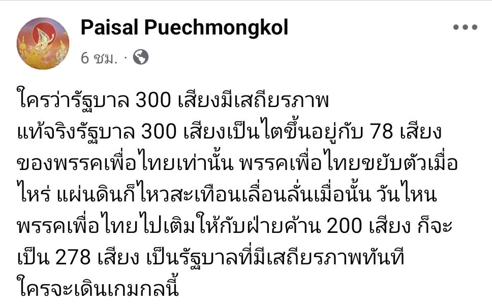 แท้จริงรัฐบาล 300 เสียงเป็นไตขึ้นอยู่กับ 78 เสียงของพรรคเพื่อไทยเท่านั้น พรรคเพื่อไทยขยับตัวเมื่อไหร่ แผ่นดินก็ไหวสะเทือนเลื่อนลั่นเมื่อนั้น