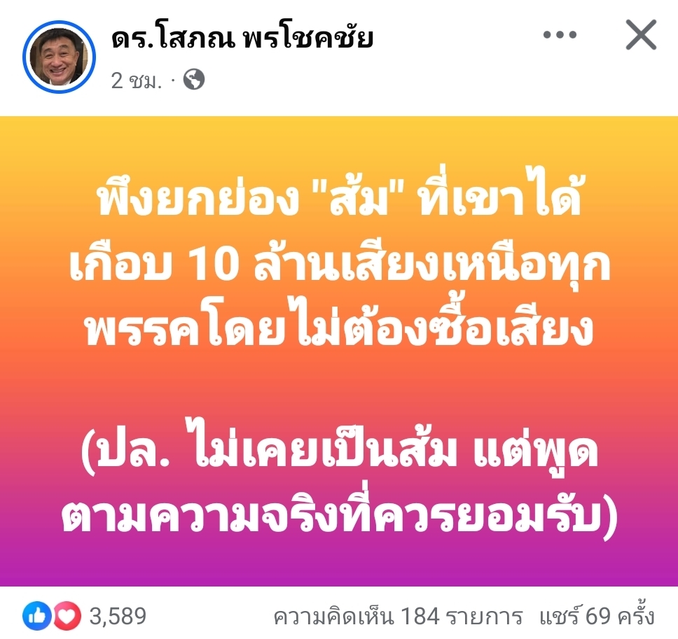 ดร.โสภณ ชี้ พูดตามความจริงที่ควรยอมรับ ส้ม เกือบ 10 ล้านเสียง