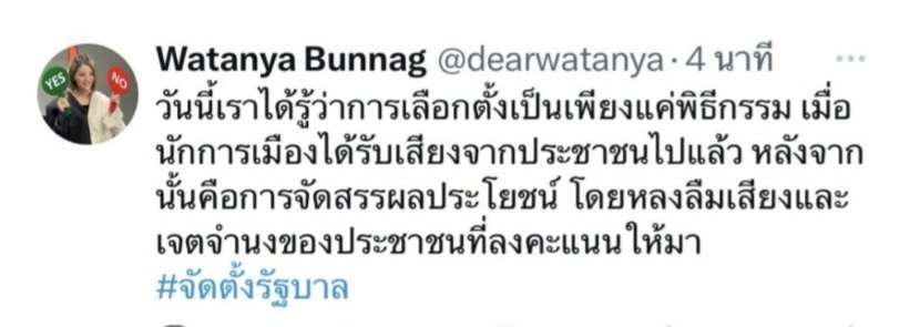 “วันนี้เราได้รู้ว่าการเลือกตั้งเป็นเพียงแค่พิธีกรรม เมื่อนักการเมืองได้รับเสียงจากประชาชนไปแล้ว หลังจากนั้นคือการจัดสรรผลประโยชน์ โดยหลงลืมเสียงและเจตจำนงของประชาชนที่ลงคะแนนให้มา # จัดตั้งรัฐบาล”