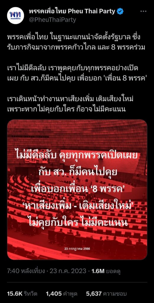 “พรรคเพื่อไทย ในฐานะแกนนำจัดตั้งรัฐบาล ซึ่งรับภารกิจมาจากพรรคก้าวไกล และ 8 พรรคร่วม เราไม่มีดีลลับ เราพูดคุยกับทุกพรรคอย่างเปิดเผย กับ สว.ก็มีคนไปคุย เพื่อบอก ‘เพื่อน 8 พรรค’ เราเดินหน้าทำงานหาเสียงเพิ่ม เติมเสียงใหม่ เพราะหากไม่คุยกับใคร ก็อาจไม่มีคะแนน”