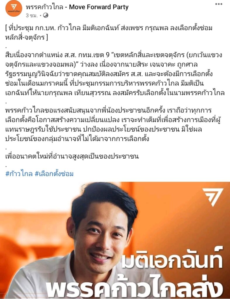 ผู้สื่อข่าวโตโจ้นิวส์รายงานว่า วันที่ 24 ธ.ค.64 พรรคก้าวไกล เปิดเผยว่า สืบเนื่องจากตำแหน่ง ส.ส. กทม.เขต 9 “เขตหลักสี่และเขตจตุจักร (ยกเว้นแขวงจตุจักรและแขวงจอมพล)” ว่างลง เนื่องจากนายสิระ เจนจาคะ ถูกศาลรัฐธรรมนูญวินิจฉัยว่าขาดคุณสมบัติลงสมัคร ส.ส. และจะต้องมีการเลือกตั้งซ่อมในเดือนมกราคมนี้ ที่ประชุมกรรมการบริหารพรรคก้าวไกล มีมติเป็นเอกฉันท์ให้นายกรุณพล เทียนสุวรรณ ลงสมัครรับเลือกตั้งในนามพรรคก้าวไกล