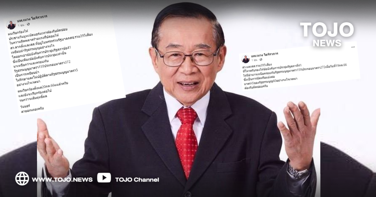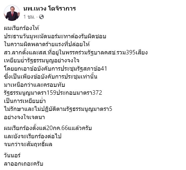 เป็นการเหยียบย่ำ ไม่รักษา และไม่ปฏิบัติตามรัฐธรรมนูญ มาตรา 5 อย่างจงใจเจตนา ผมเรียกร้องตั้งแต่วันที่ 20 ก.ค.66 แแล้วครับ และยังจะเรียกร้องต่อไปจนกว่าจะสัมฤทธิ์ผล