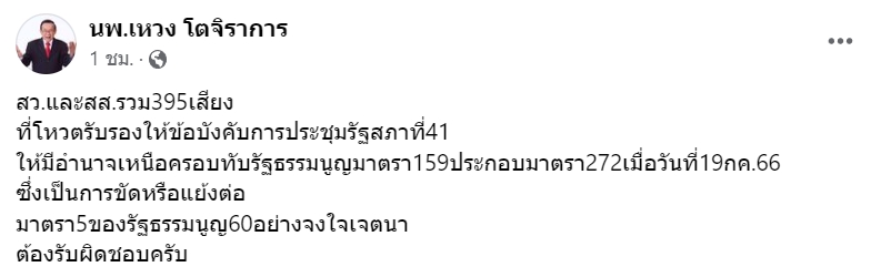 หมอเหวง สว.และ สส.รวม 395 เสียง ที่โหวตรับรองให้ข้อบังคับการประชุมรัฐสภา ข้อที่ 41 มีอำนาจเหนือครอบทับรัฐธรรมนูญ ต้องรับผิดชอบ