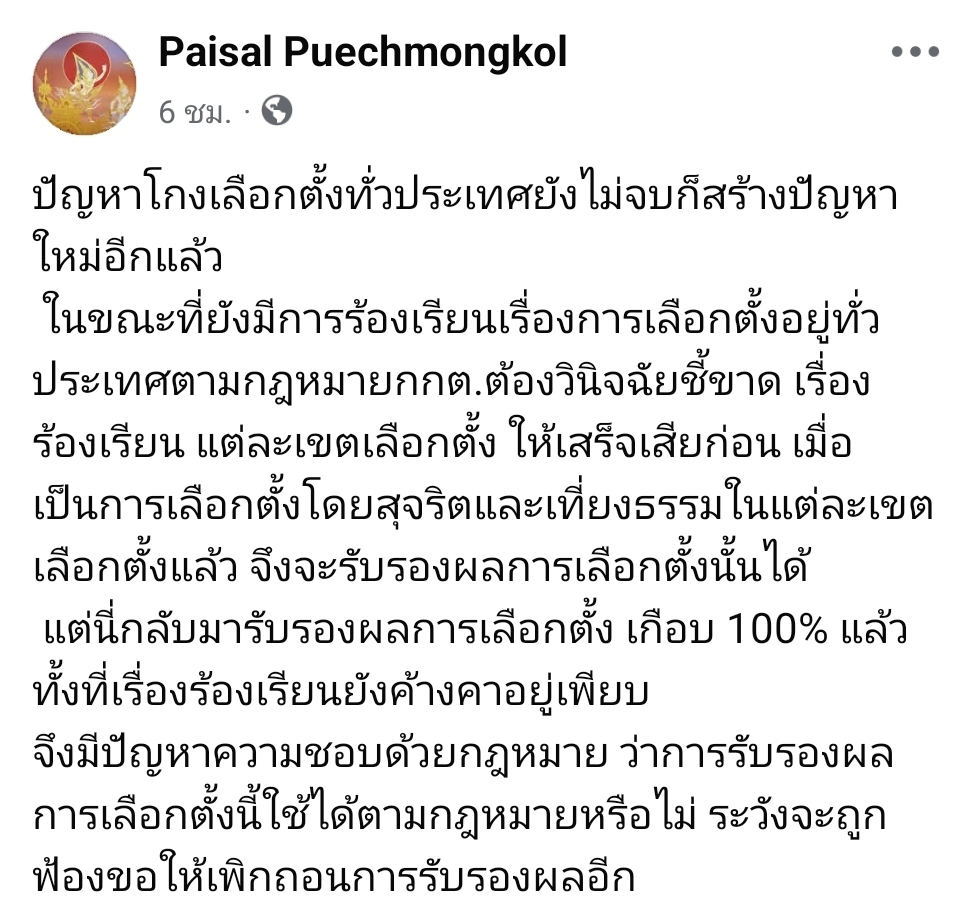 แต่นี่กลับมารับรองผลการเลือกตั้ง เกือบ 100% แล้ว ทั้งที่เรื่องร้องเรียนยังค้างคาอยู่เพียบ