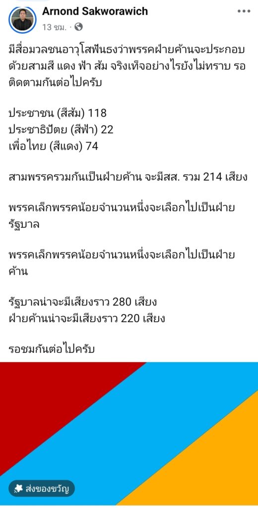 มีสื่อมวลชนอาวุโสฟันธงว่าพรรคฝ่ายค้านจะประกอบด้วยสามสี แดง ฟ้า ส้ม จริงเท็จอย่างไรยังไม่ทราบ รอติดตามกันต่อไปครับ