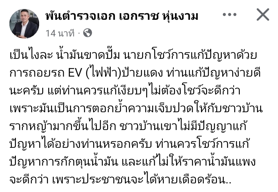 พ.ต.อ.เอกราช ชี้ ตอกย้ำความเจ็บปวด คนรากหญ้า น้ำมันขาดปั๊ม นายกโชว์การแก้ปัญหาด้วยการถอยรถ EV (ไฟฟ้า)ป้ายแดง