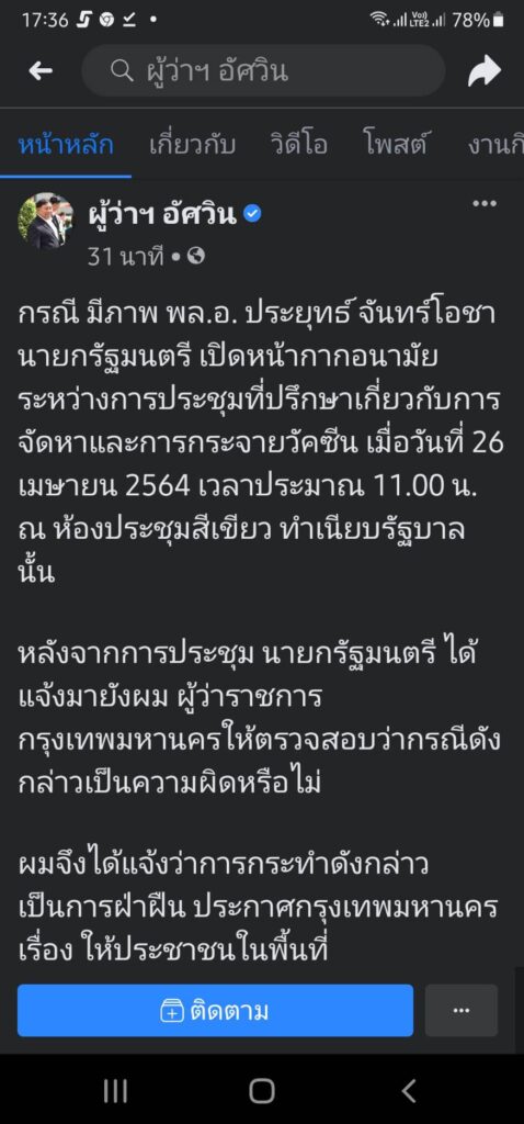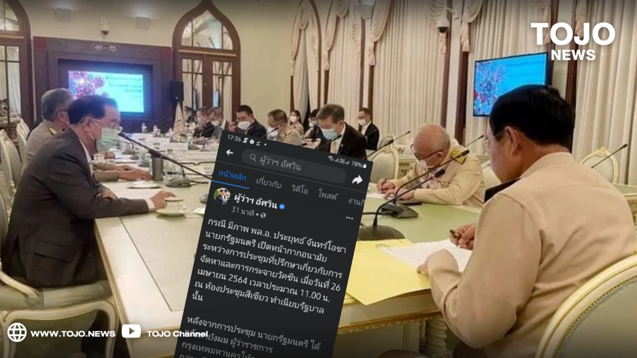ผู้สื่อข่าวโตโจ้นิวส์รายงานว่า พล.ต.อ.อัศวิน ขวัญเมือง ผู้ว่าราชการกรุงเทพมหานคร เปิดเผยว่า จากกรณี มีภาพ พล.อ.ประยุทธ์ จันทร์โอชา นายกรัฐมนตรี เปิดหน้ากากอนามัยระหว่างการประชุมที่ปรึกษาเกี่ยวกับการจัดหาและการกระจายวัคซีน เมื่อวันที่ 26 เมษายน 2564 เวลาประมาณ 11.00 น. ณ ห้องประชุมสีเขียว ทำเนียบรัฐบาล นั้น หลังจากการประชุม นายกรัฐมนตรี ได้แจ้งมายังผม ผู้ว่าราชการกรุงเทพมหานครให้ตรวจสอบว่ากรณีดังกล่าวเป็นความผิดหรือไม่