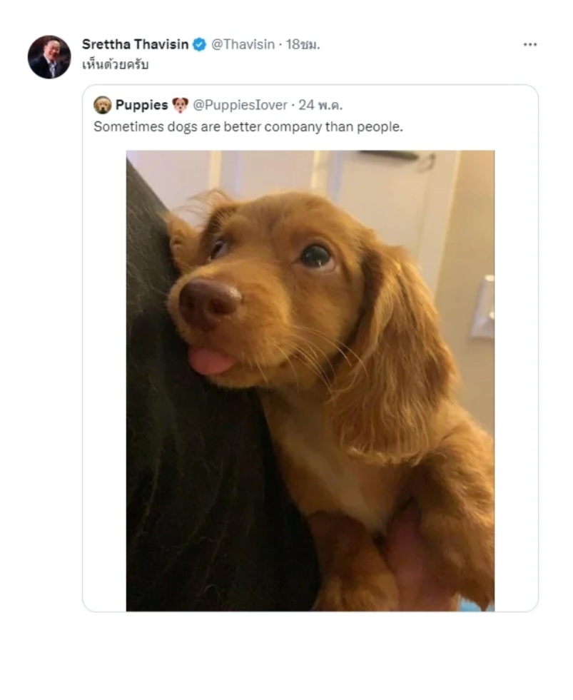 ผู้สื่อข่าวโตโจ้นิวส์รายงานว่า นายเศรษฐา ทวีสิน แคนดิเดตนายกรัฐมนตรี พรรคเพื่อไทย ได้รีทวิต รูปภาพสุนัข และข้อความในทวิตเตอร์ที่ว่า “Sometimes dogs are better company than people.” (บางครั้งสุนัขเป็นเพื่อนที่ดีกว่าคน) โดยนายเศรษฐาระบุว่า “เห็นด้วยครับ”