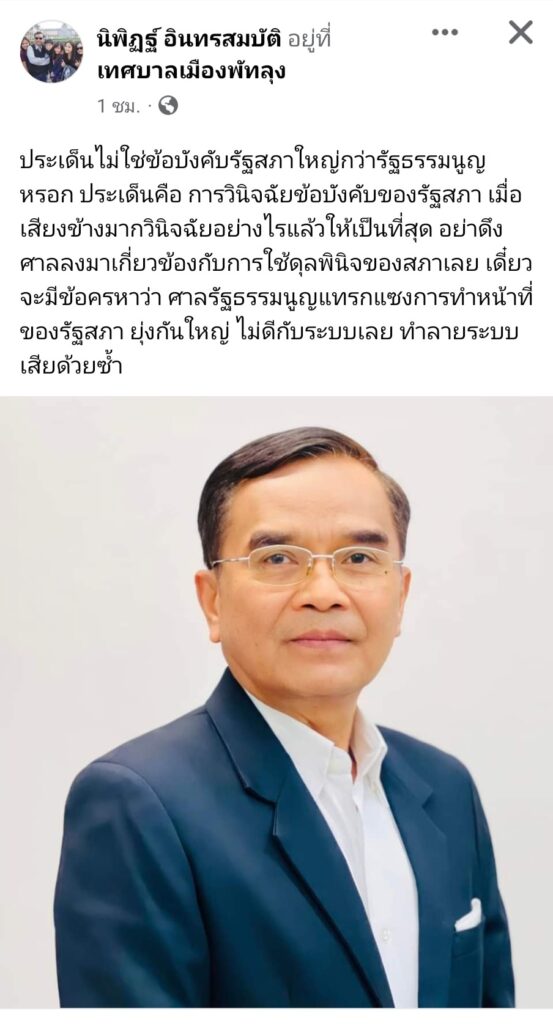 ผู้สื่อข่าวโตโจ้นิวส์รายงานว่า นายนิพิฏฐ์ อินทรสมบัติ สมาชิกพรรคพลังประชารัฐ โพสต์เฟซบุ๊กระบุว่า ประเด็นไม่ใช่ข้อบังคับรัฐสภาใหญ่กว่ารัฐธรรมนูญหรอก ประเด็นคือ การวินิจฉัยข้อบังคับของรัฐสภา