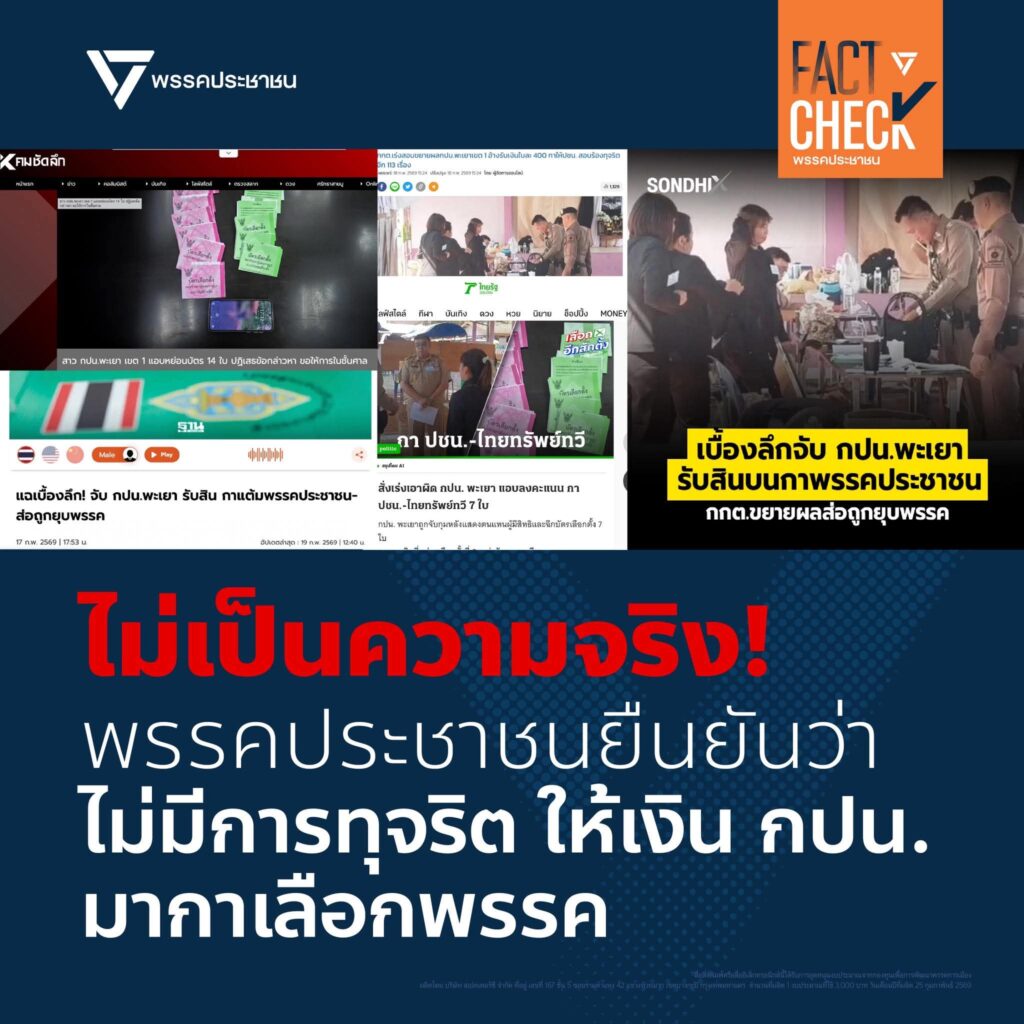 พรรคประชาชนขอชี้เแจงว่าข่าวนี้ไม่เป็นความจริง พรรคและผู้สมัคร สส. เขต 1 จังหวัดพะเยา ไม่มีส่วนเกี่ยวข้องใดๆ กับการกระทำดังกล่าว จุดยืนพรรคประชาชนไม่ยอมรับการทุจริตทุกกรณี และจะเดินหน้าอย่างต่อเนื่องเพื่อตรวจสอบการทุจริตและความไม่โปร่งใสในการเลือกตั้ง
