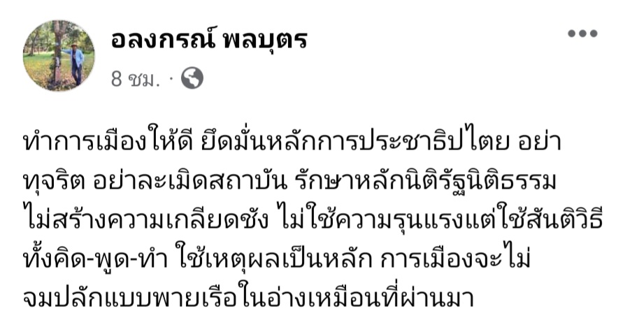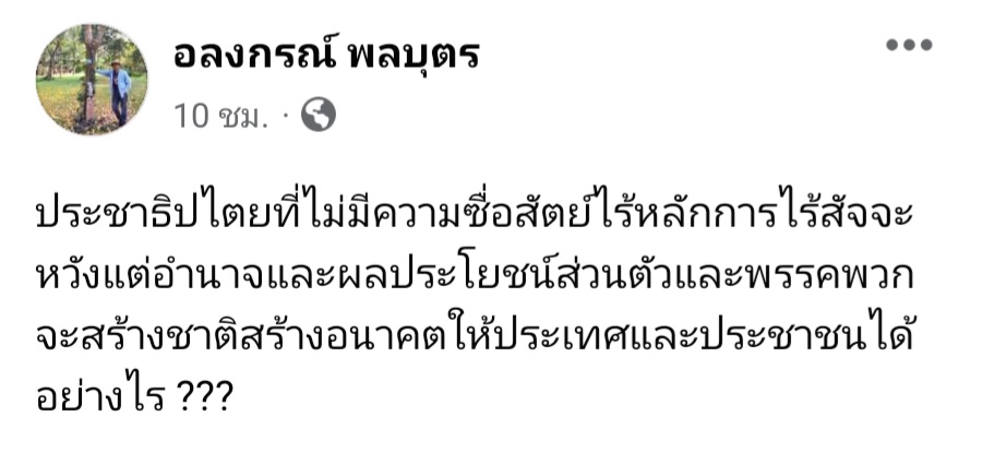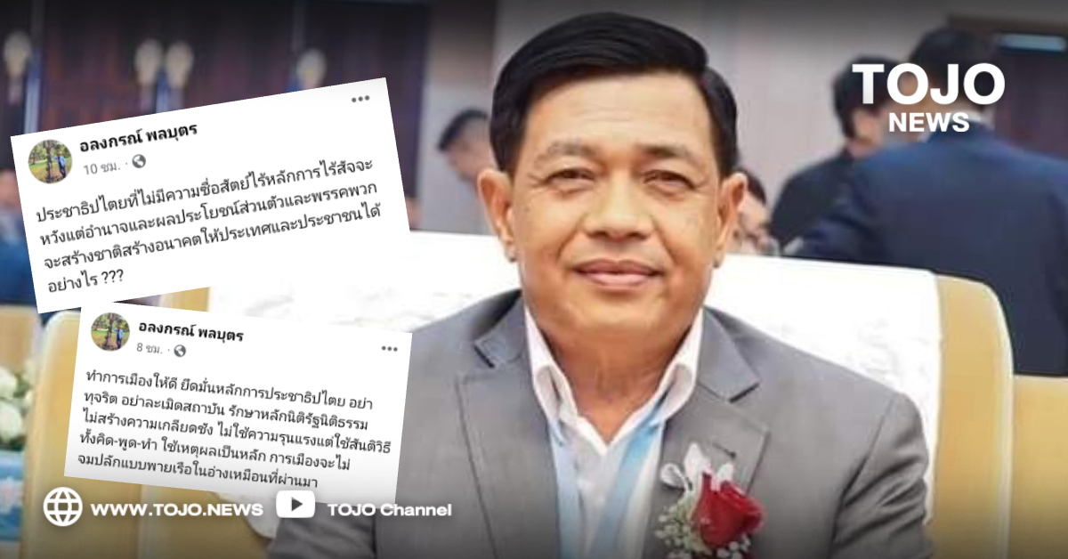ผู้สื่อข่าวโตโจ้นิวส์รายงานว่า นายอลงกรณ์ พลบุตร รักษาการรองหัวหน้าพรรคประชาธิปัตย์ โพสต์ข้อความผ่านเฟซบุ๊กส่วนตัว ชื่อ อลงกรณ์ พลบุตร ระบุว่า