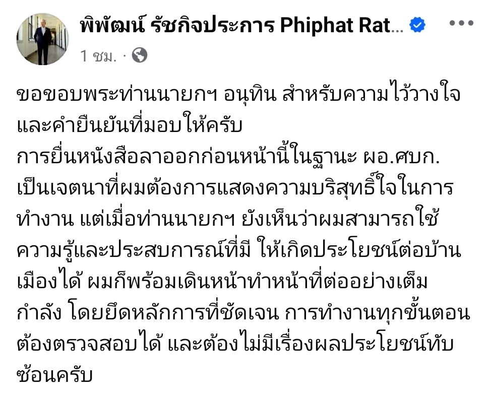 การยื่นหนังสือลาออกก่อนหน้านี้ในฐานะ ผอ.ศบก.เป็นเจตนาที่ผมต้องการแสดงความบริสุทธิ์ใจในการทำงาน แต่เมื่อท่านนายกฯ ยังเห็นว่าผมสามารถใช้ความรู้และประสบการณ์ที่มี ให้เกิดประโยชน์ต่อบ้านเมืองได้ ผมก็พร้อมเดินหน้าทำหน้าที่ต่ออย่างเต็มกำลัง โดยยึดหลักการที่ชัดเจน การทำงานทุกขั้นตอนต้องตรวจสอบได้ และต้องไม่มีเรื่องผลประโยชน์ทับซ้อนครับ”